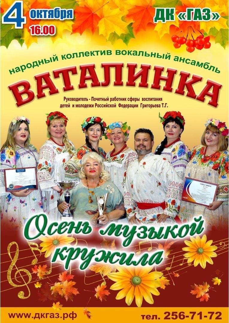 1 октября 2023 в 16:00 приглашаем на концерт народного коллектива вокального ансамбля “Ваталинка” Осень вновь закружит нас в душевных, добрых песнях. Будем рады Вам и Вашим близким. Давайте проведём воскресный вечер вместе! Билеты в кассе #ДКГАЗ